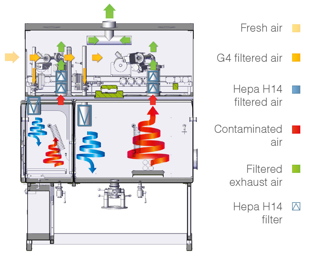 Další úrovní ochrany kritických bodů v procesu je vytvoření tlakové kaskády, takže okolí, kde se manipuluje s nebezpečnou látkou, je v místě s nejvyšším podtlakem. Tím se minimalizuje riziko kontaminace jiných komor nebo okolí.